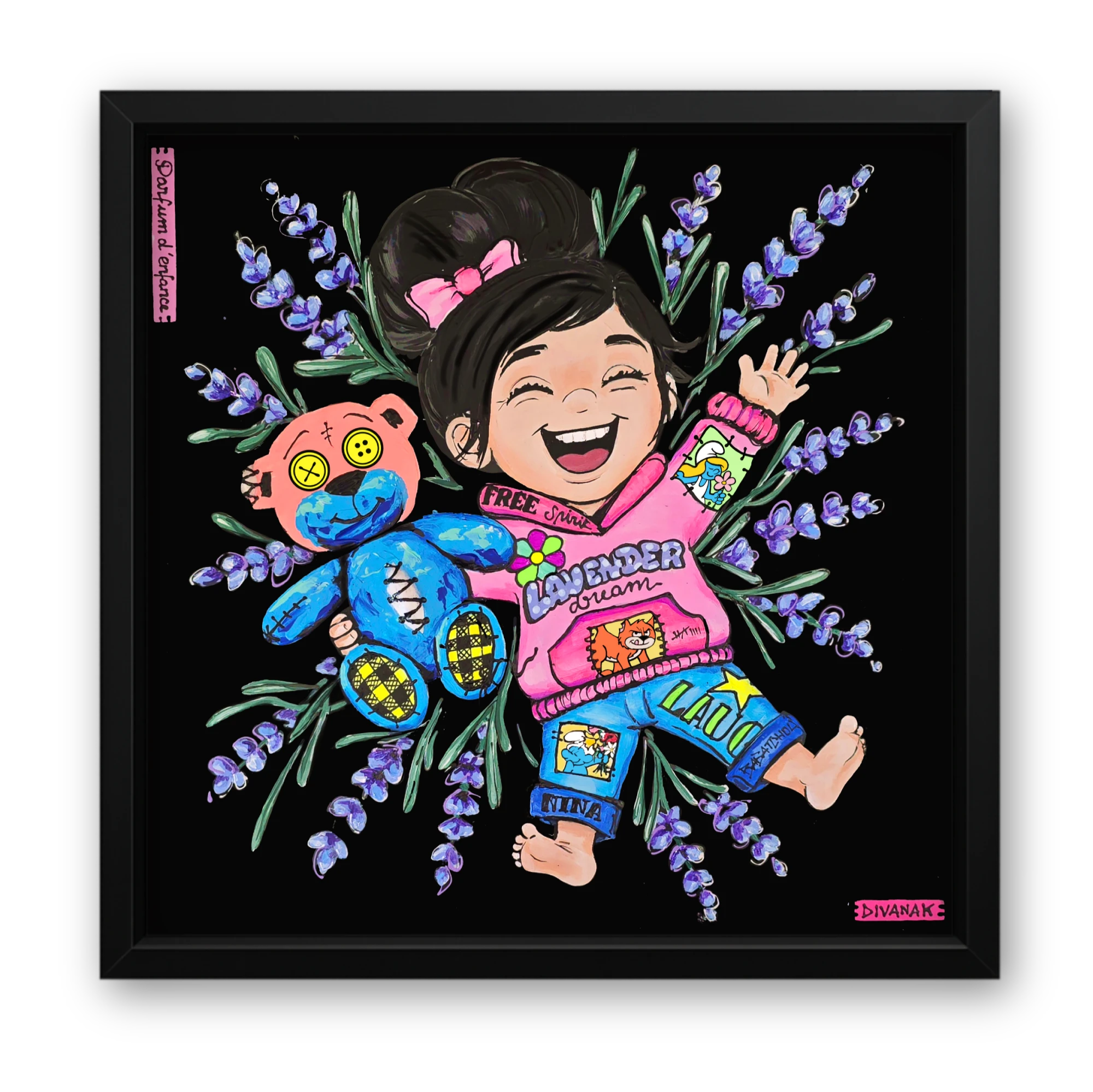 Peinture originale évoquant la douceur de l’enfance, entre joie simple et souvenirs parfumés.